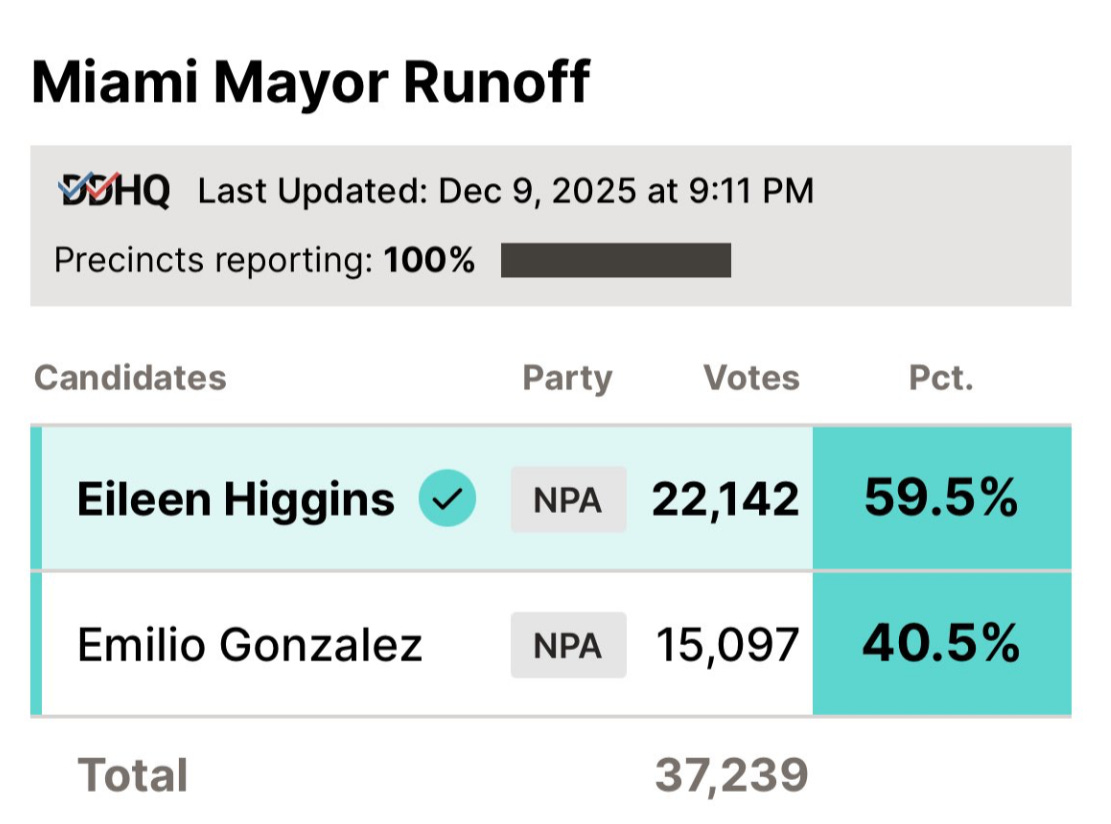 To put this in some perspective, Kamala Harris won the city by just one point in 2024. But Eileen Higgins, a white candidate in this largely Cuban city, won by a whopping 19.