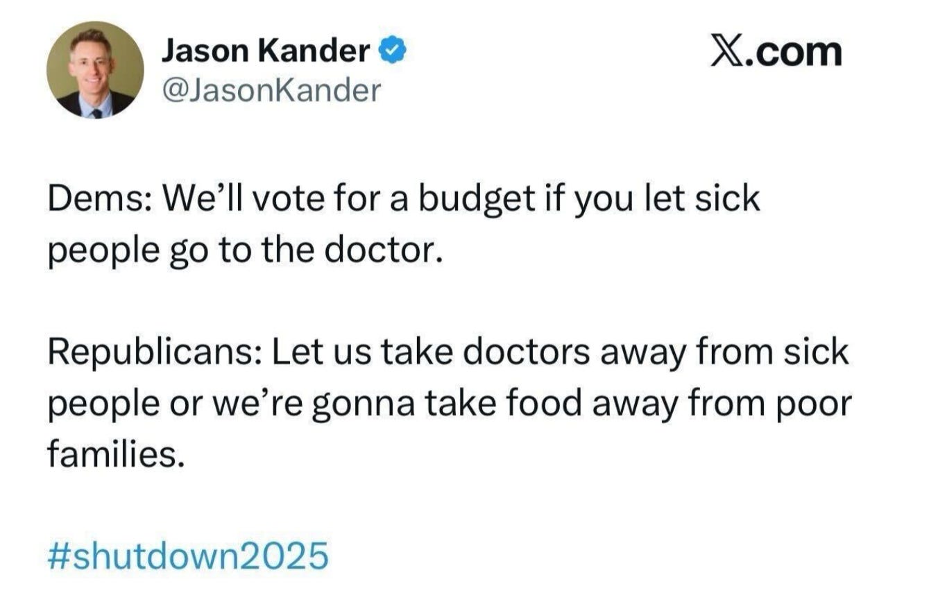 Hypotheticals rolling around in my head: might the WH/GOP hold out until right before Thanksgiving to appear to be the 'saviors'? Other than just being callous self-serving aholes, is this truly just to keep the Epstein files from being released?