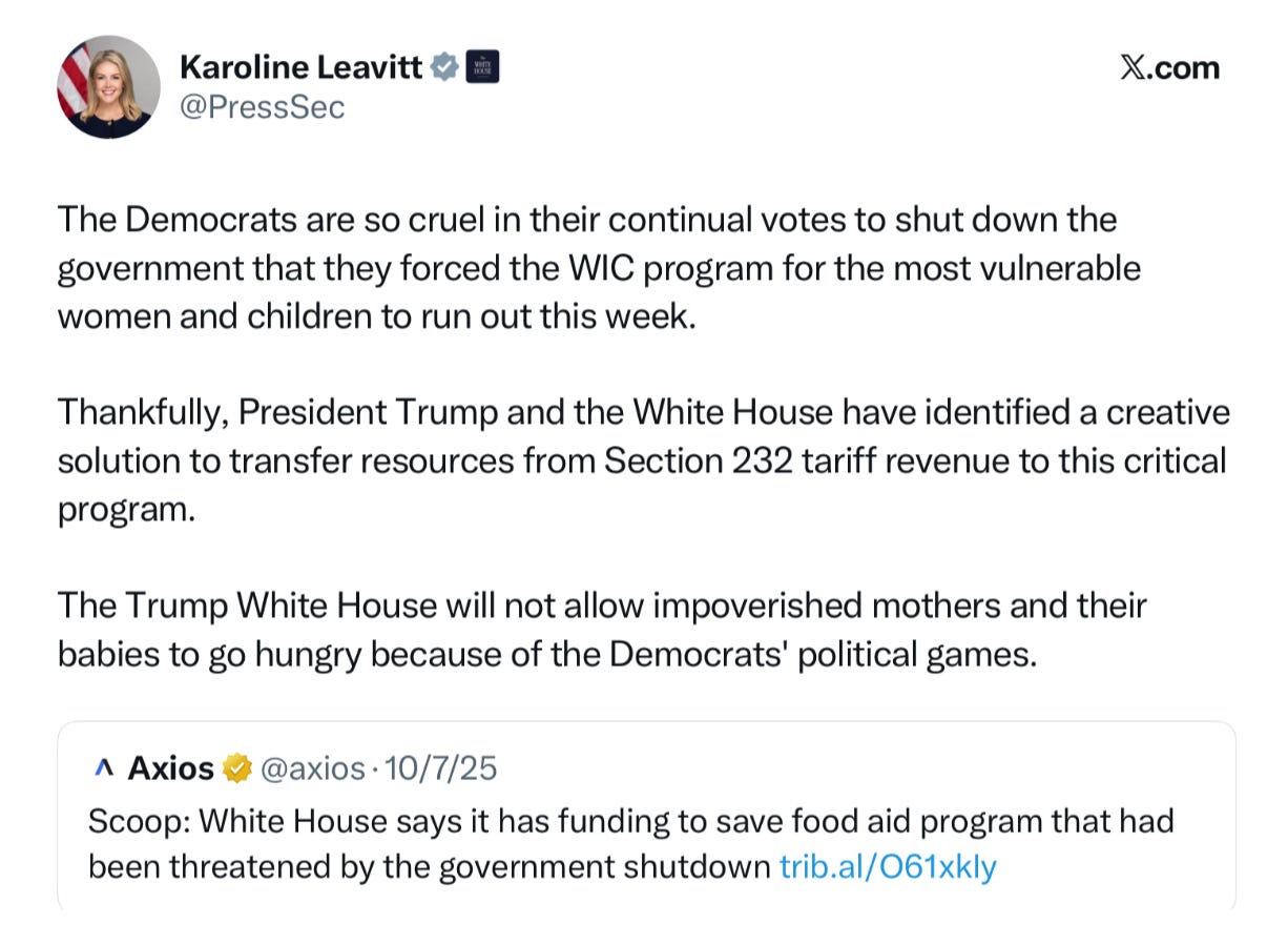 Moreover, the White House specifically reassured the public that it would use tariff revenue to supplement the Special Supplemental Nutrition Program for WIC as the government shutdown reached its tenth day. As Politico reported on October 7,