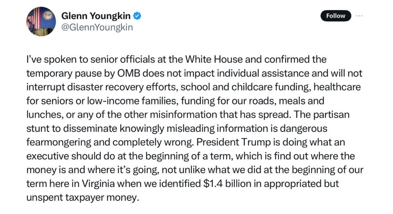 Gov. Glenn Youngkin (R-VA) admitted that he had to reach out to the White House to find out what was impacted. He assured Virginians that the pause would not impact individual assistance or other key programs. But he couldn’t help himself. He labeled Democratic outrage over the apparent loss of Medicare, Head Start and other funds as a “partisan stunt to disseminate knowingly misleading information” and said such actions were “dangerous fearmongering and completely wrong.”