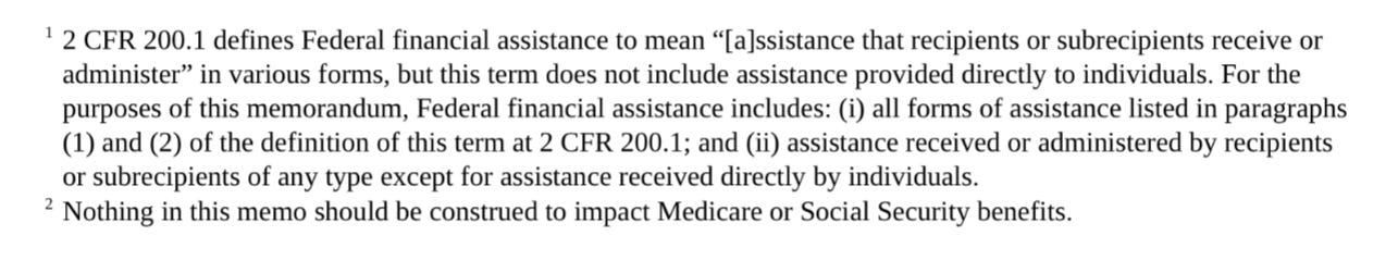 In case there was any doubt, the memo dropped a footnote explaining that Federal financial assistance meant “(a)ssistance that recipients or subrecipients receive or administer,” except where the assistance was “provided directly to individuals.” To make their intent even clearer, Footnote 2 declared that the freeze would not impact two very specific programs, Medicare and Social Security.