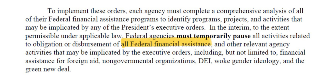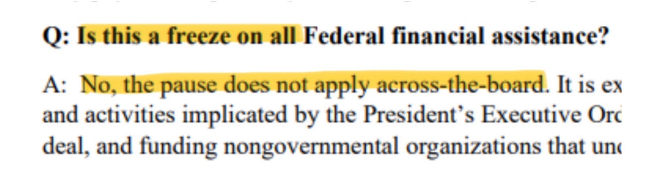 Funny, because OMB had just said it was pausing “all” Federal financial assistance that wasn’t direct assistance. And now it says the pause doesn’t apply across the board? Which is it?