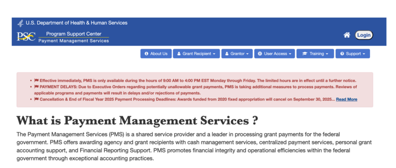 In place of the regular access to funds was a prominent red banner warning that there would be delays due to “executive orders” on disallowed grants.