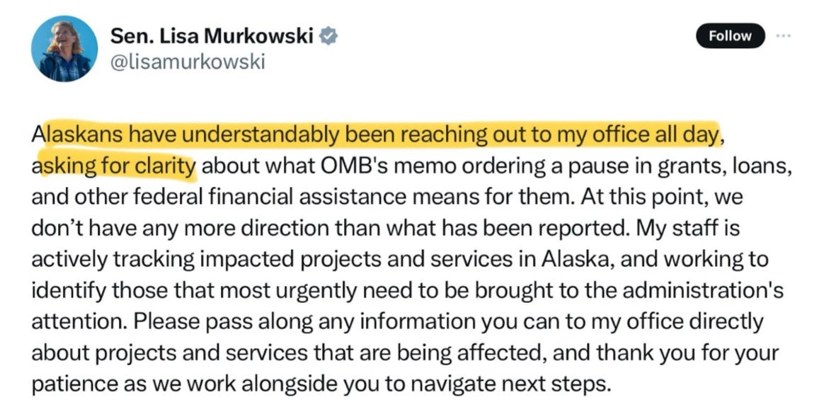 Sen. Lisa Murkowski (R-AK), for example, posted that “Alaskans have understandably been reaching out to my office all day, asking for clarity, about what OMB’s memo ordering a pause in grants, loans and other financial assistance means for them.” She noted, “At this point, we don’t have any more direction than what has been reported.”
