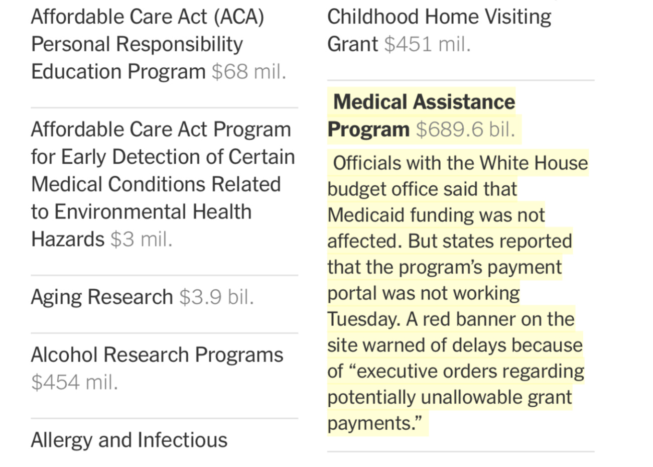 In sum, a clearer message could hardly have been imagined: The Monday night massacre of a OMB memo had declared that “all” financial assistance was now frozen; Medicaid and other key programs like SNAP and Head Start were not listed among the programs excepted from the freeze; and by no coincidence the whole payment portal went down with a big red message saying payment delays would result from “Executive Orders regarding potentially unallowable grant payments.”