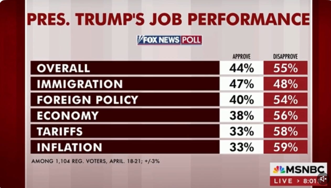This administration is failing. It’s tanked the economy, sown deep doubt and mistrust with our allies, and displayed its incompetence and malice at every turn. This is not just me wish casting. The American voters are saying this very clearly. Trump’s approval numbers, for example, fell below 40 percent in two major polls out today. The Associated Press/NORC poll and the ABC News/Washington Post/Ipsos poll both have him at just 39 percent, the worst of any president at this point in his term in some 80 years of polling.