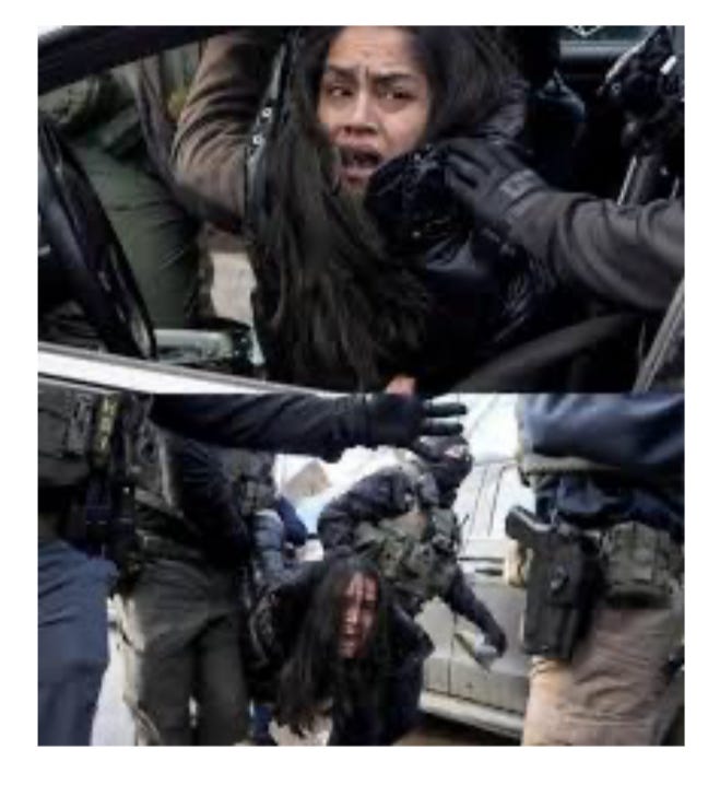 One agent waved a long knife before her face, which she feared would be used against her. Instead, he cut her seatbelt. Moments later, Moments later, her face hit the ground and agents pressed their weight onto her back. Rahman was then carried facedown through the street by her cuffed limbs.