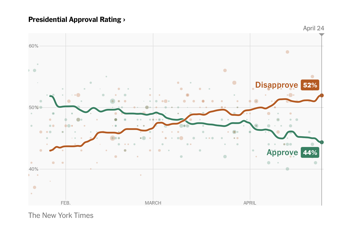 The New York Times average of polls also shows a steep decline, with Trump now at 45 percent approval and 52 percent disapproval. The direction of the two lines has been fairly consistent since he took office.