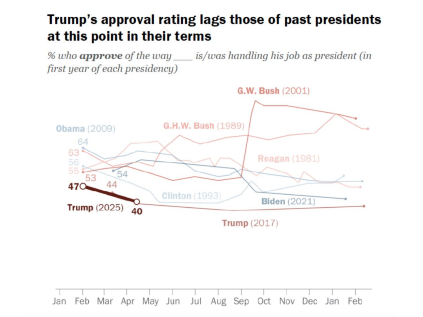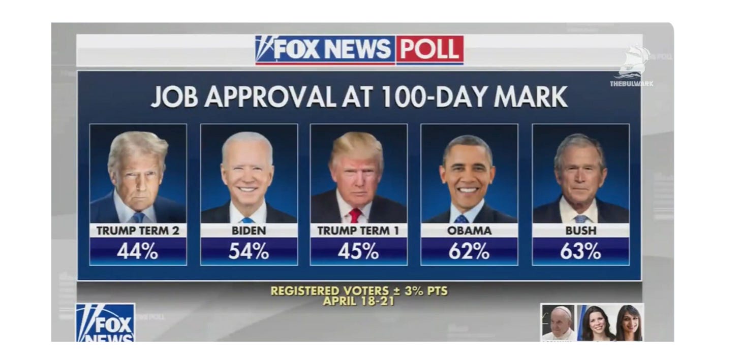 These poor numbers align with a Pew poll out yesterday. That survey found Trump with just a 40 percent approval rating, tied with Trump 1.0 for lowest approval rating of any president at this point.