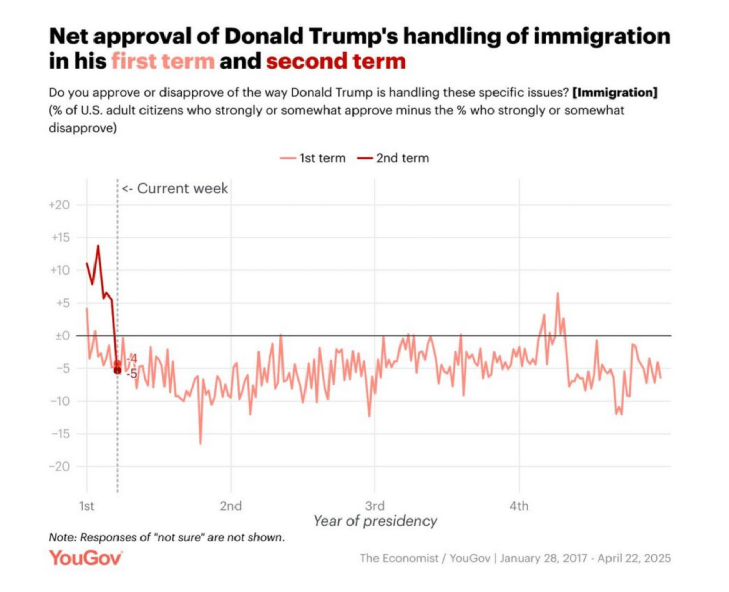 But it’s not going as planned. Trump’s numbers have fallen over his immigration policies and he is now underwater on the question. A YouGov poll puts him at -5 on his handling of immigration, a sharp drop from prior weeks.