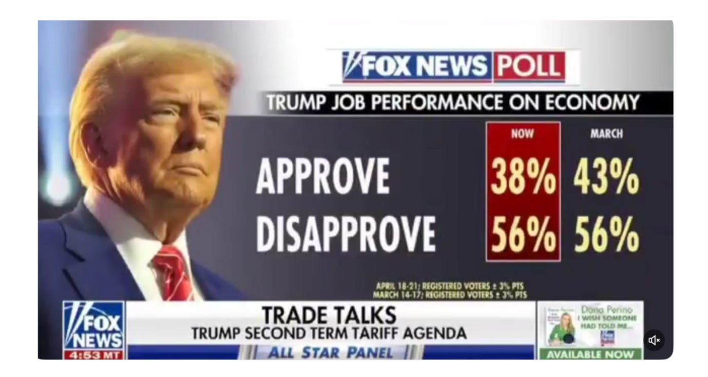 Note how in March his approval numbers on the economy were five points higher, even while his disapprovals didn’t shift. Those once approving voters are now uncertain as markets have gone into free fall, federal workers face mass layoffs, and there are reports of empty cargo vessels from China due to sky high tariffs.