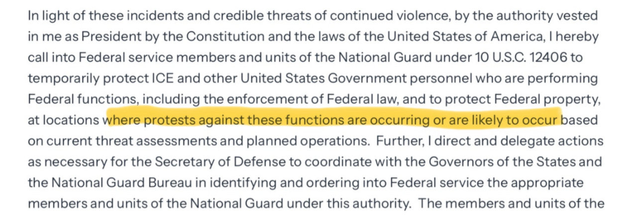 The plans they have in place aren’t limited to what’s happening in Los Angeles. A closer reading of the memo reveals that they intend to federalize National Guard forces wherever there are anti-ICE protests, saying they will do so “where protests against [federal] functions are occurring or likely to occur….”