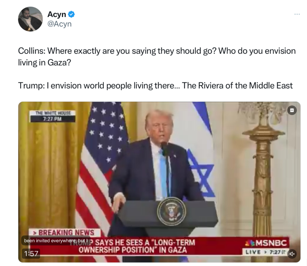 It didn’t help that Jared Kushner had been talking about this very idea of developing Gaza’s waterfront property back in March of last year. The Trumps and Kushners don’t see genocide and war; they see real estate opportunities!