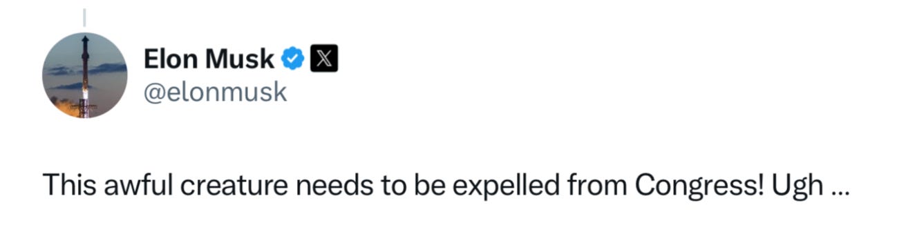 It is no small irony that Musk, a self-described “champion” of free speech, is now using his money and influence to attempt to silence critics by booting them from office, either through expulsion or by funding primaries against those who do not fall in line.