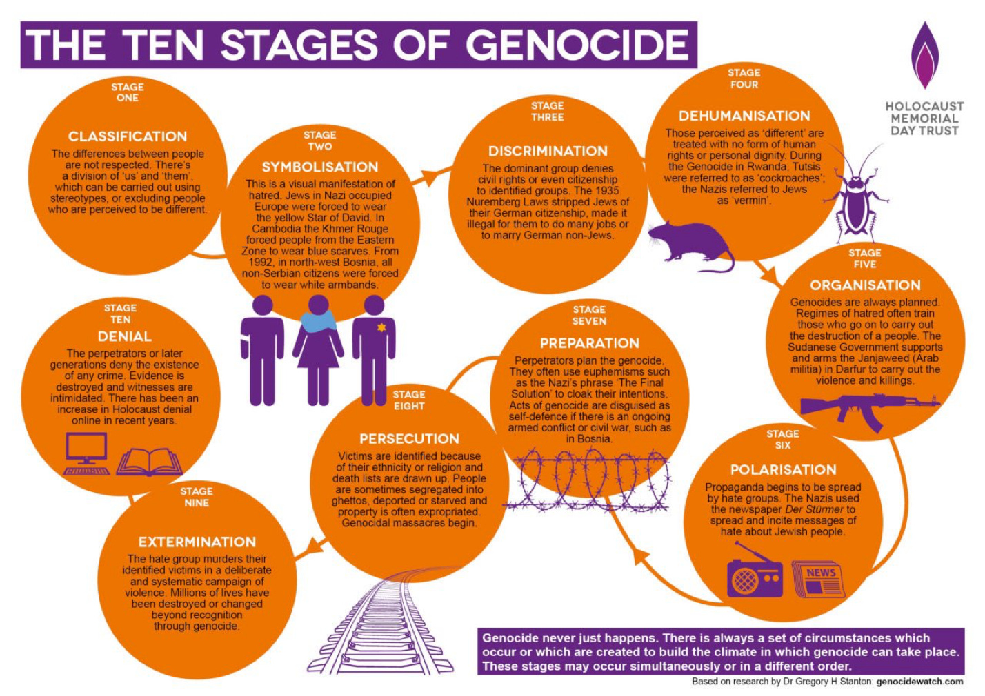 Genocide Watch lists the 10 stages that historically lead to genocide. Importantly, the group writes, “At each of the earlier stages there is an opportunity for members of the community or the International Community to halt the stages and stop genocide before it happens.”